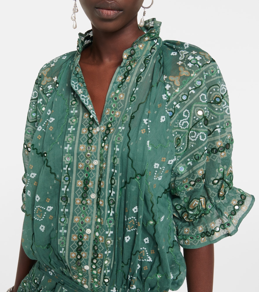 Handcrafted from lightweight cotton that??????s been handprinted, embroidered, and decorated with mirror embellishments, this Juliet Dunn shirt dress radiates warm-season vibes. It features a frilled neckline and self-tie waist.