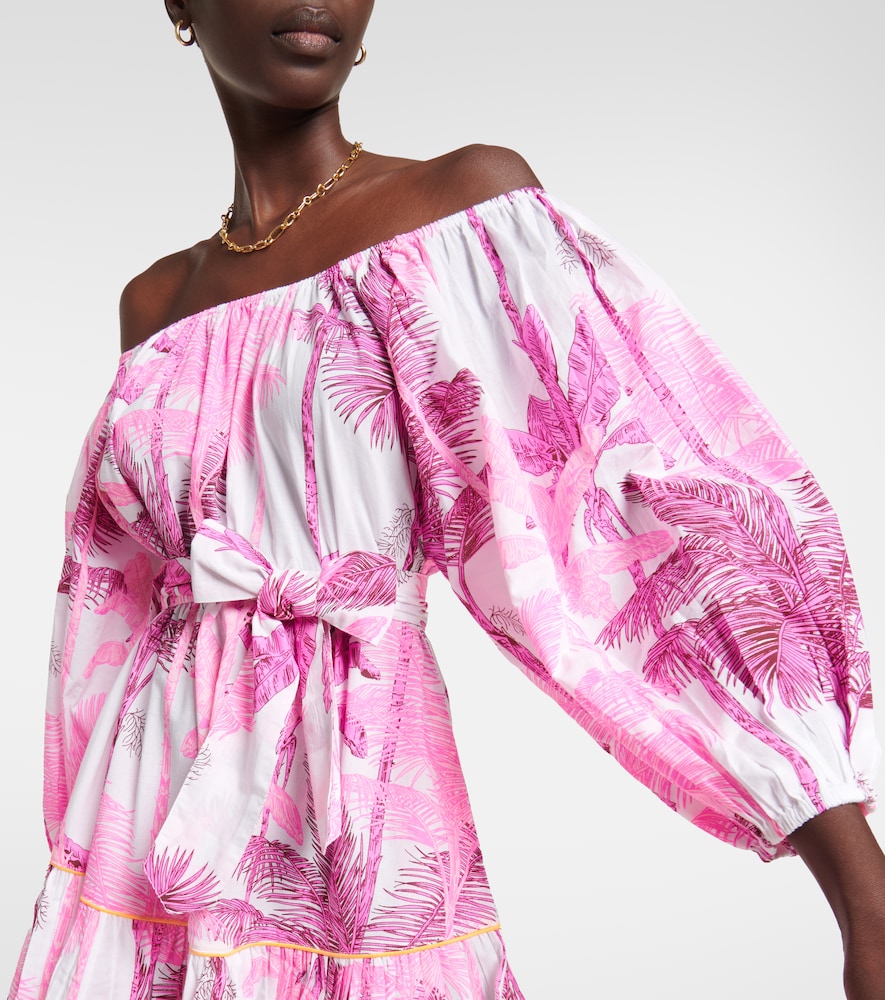 London-based designer Juliet Dunn employs Indian artisans to apply traditional techniques such as block printing, mirror work, and embroidery to her designs. This off-shoulder cotton minidress appears in a characterful floral print with piped borders.