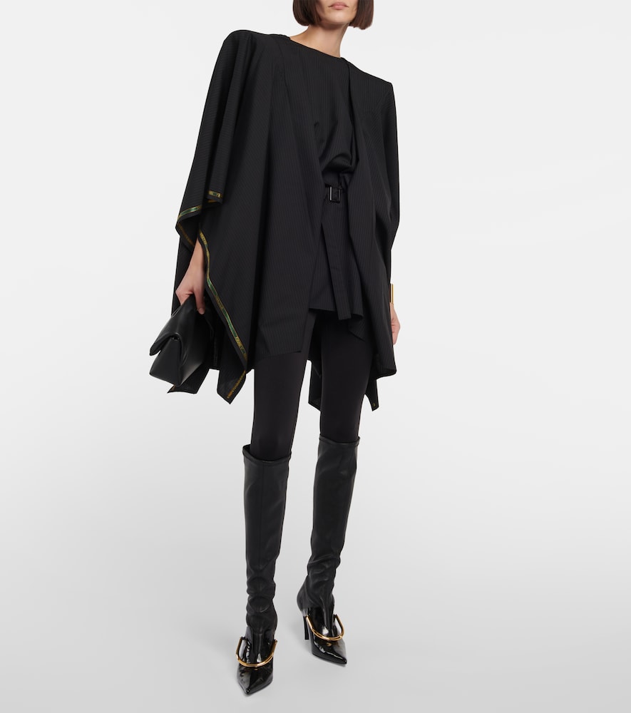 This minidress from Junya Watanabe is made from a warm wool-blend. Made in Japan, the design comes with a cape detail, features a stripe pattern, and is belted at the waist.