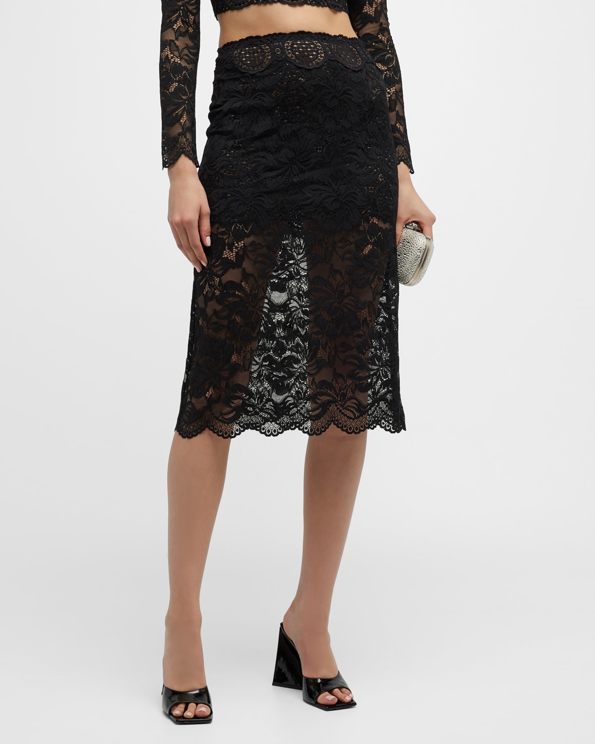 Paco Rabanne “Jupe” open-knit lace skirt High waist Straight silhouette Midi length Scallop hem Polyamide/elastane Imported