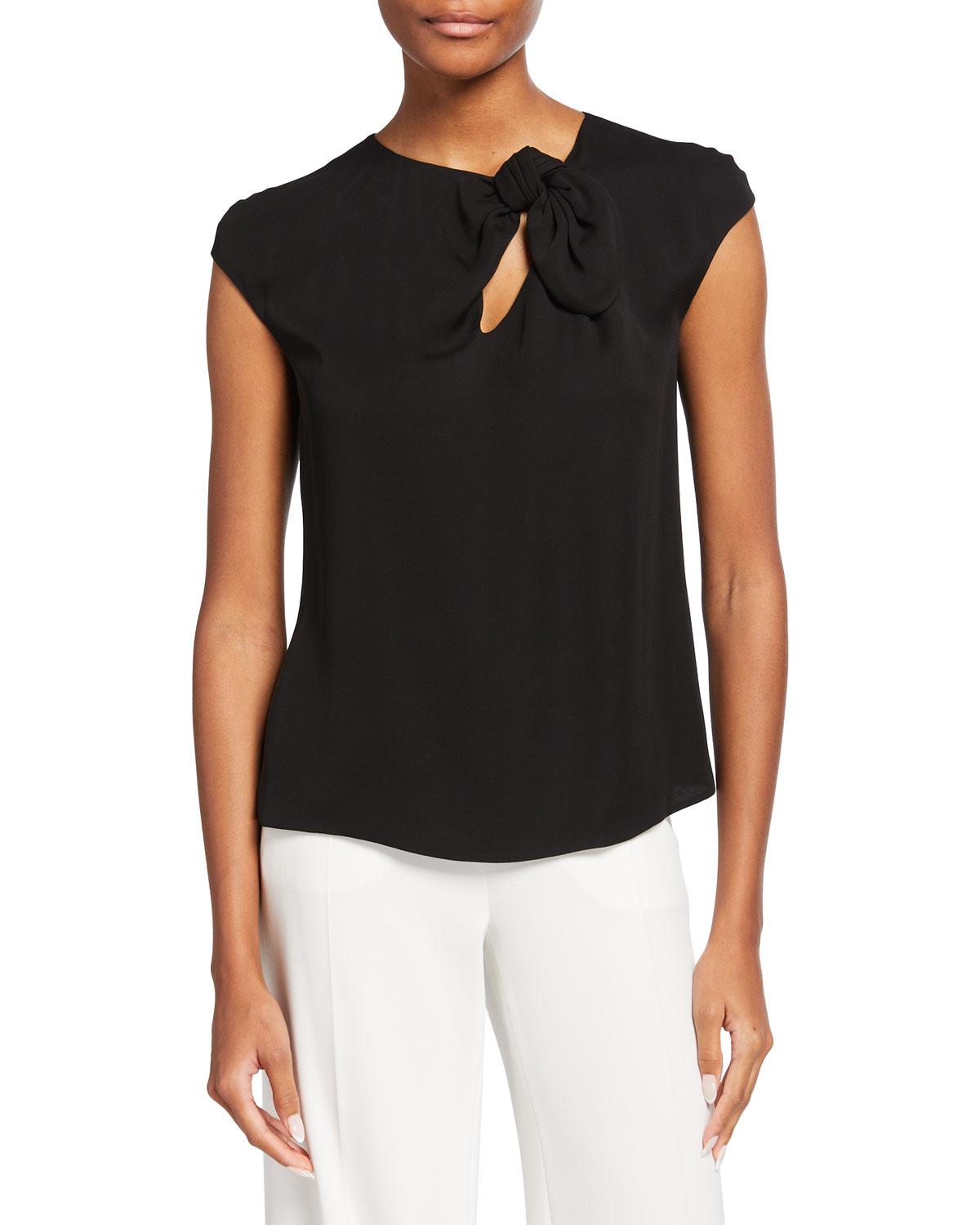 Giorgio Armani blouse in solid silk double georgette. Crew neckline; knotted keyhole. Cap sleeves. Relaxed fit. Hip length. Pullover style. Hand wash. Made in Italy.