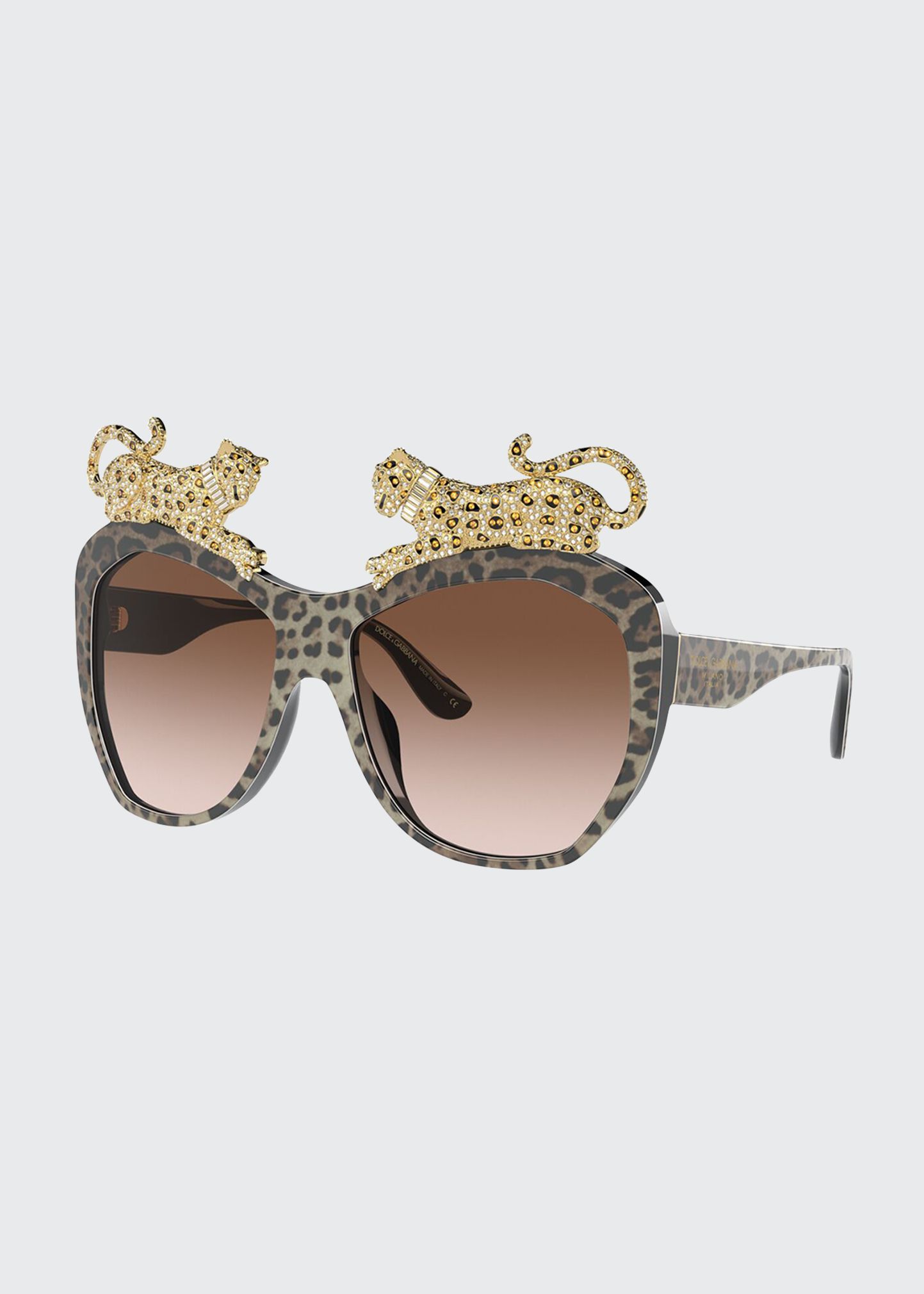 Dolce & Gabbana leopard-print butterfly sunglasses in acetate and zamak Lens/bridge/temple (in mm): 59-16-140 Features leopard figures in allover Austrian crystals Gradient lenses Logo print on temples Thin, tapered arms 100% UVA/UVB protection Made in Italy