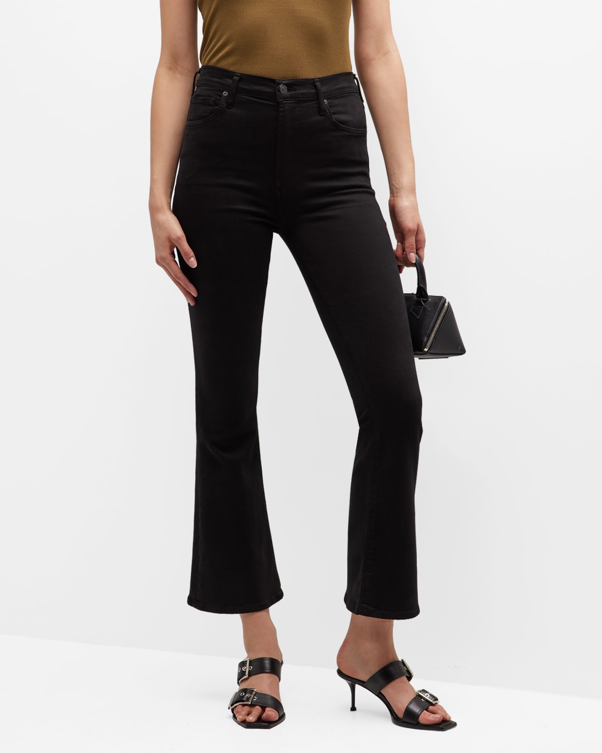 Citizens of Humanity “Lilah” bootcut jeans in black denim Approx. 30″ inseam Five-pocket style High rise Fitted through the hip; flared from knee Ankle length Button/zip fly; belt loops Cotton/polyester/spandex Imported