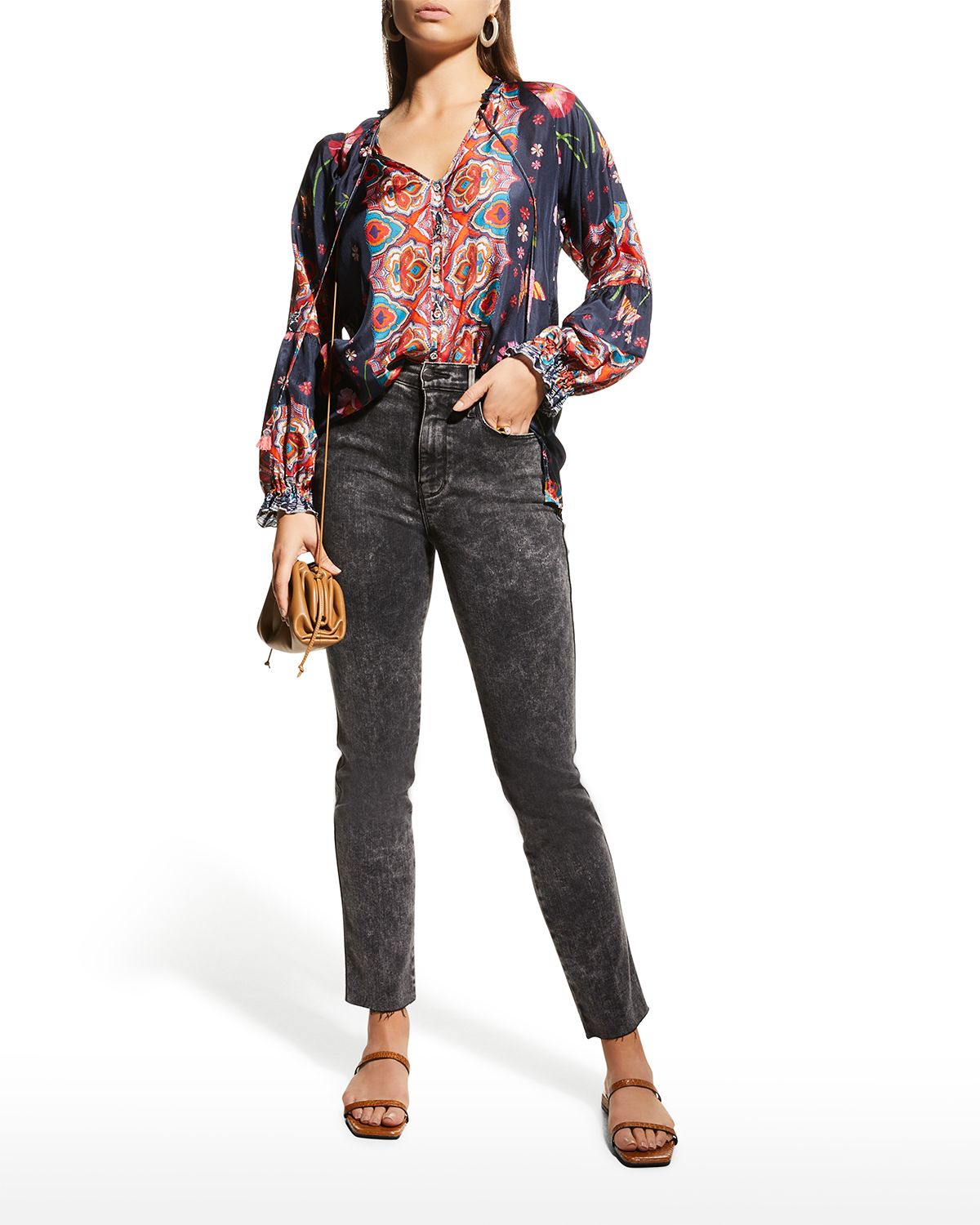 Johnny Was “Lindero Scarlett” printed habutai blouse. Split neckline with tassel ties. Button front. Long blouson sleeves. Elastic cuffs. Relaxed fit. Silk. Machine wash. Imported.