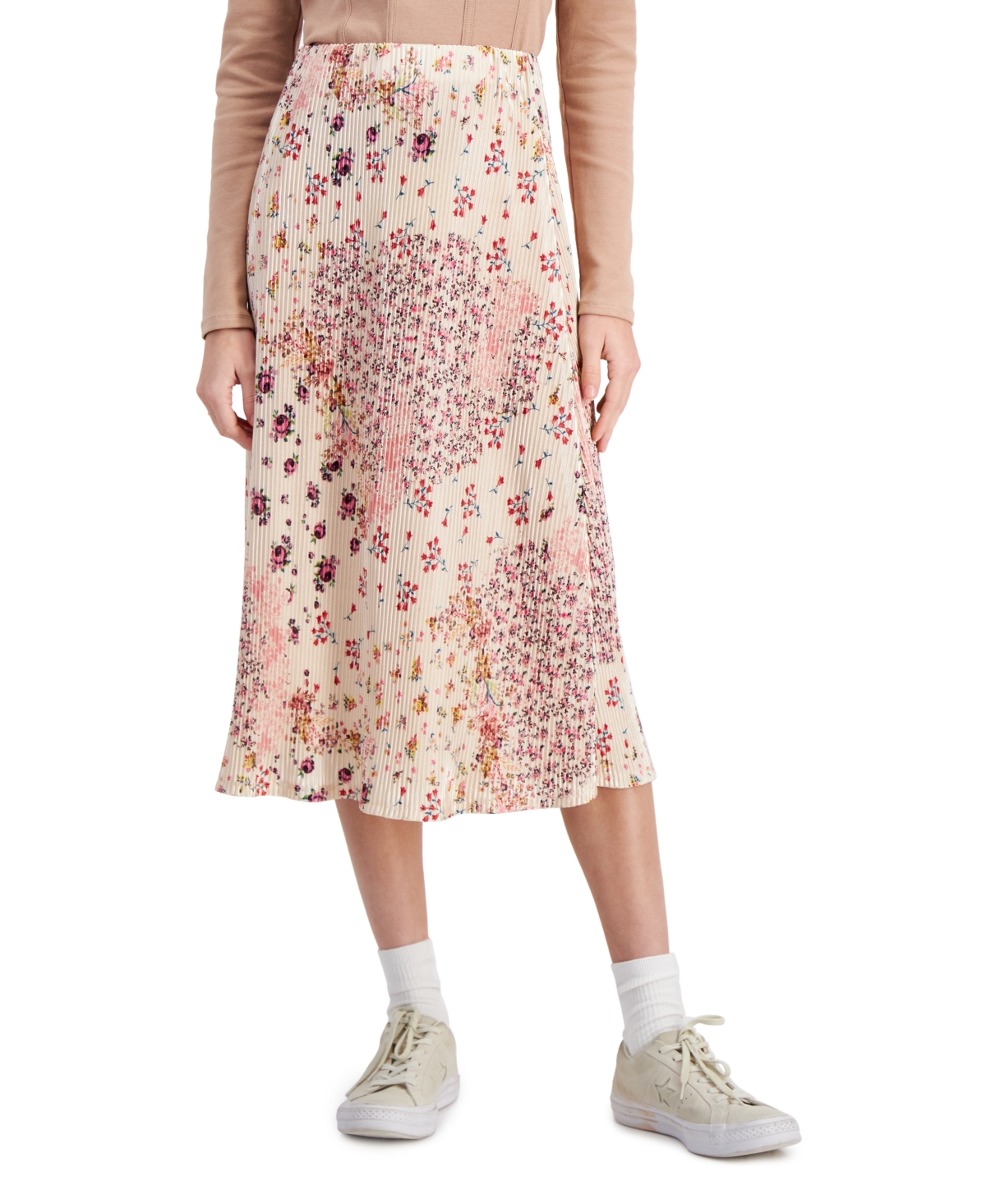 Love, Fire Women’s Pleated Elasticized-Waist Midi Skirt – Ivory Floral