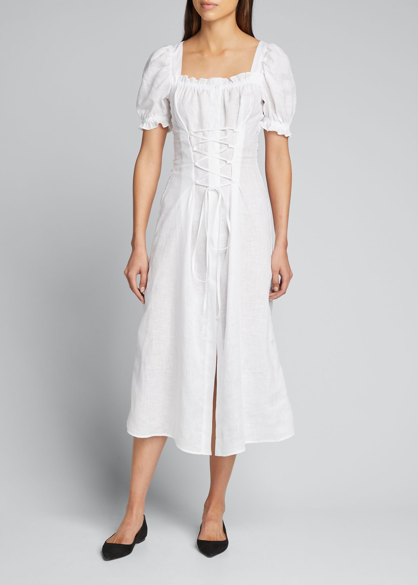 Sleeper “Marquise” dress with lace-up bodice. Approx. 48″L from shoulder to hem. Square neckline; button front. Short puff sleeves. A-line silhouette. Hem falls below the knee. Linen. Machine wash.