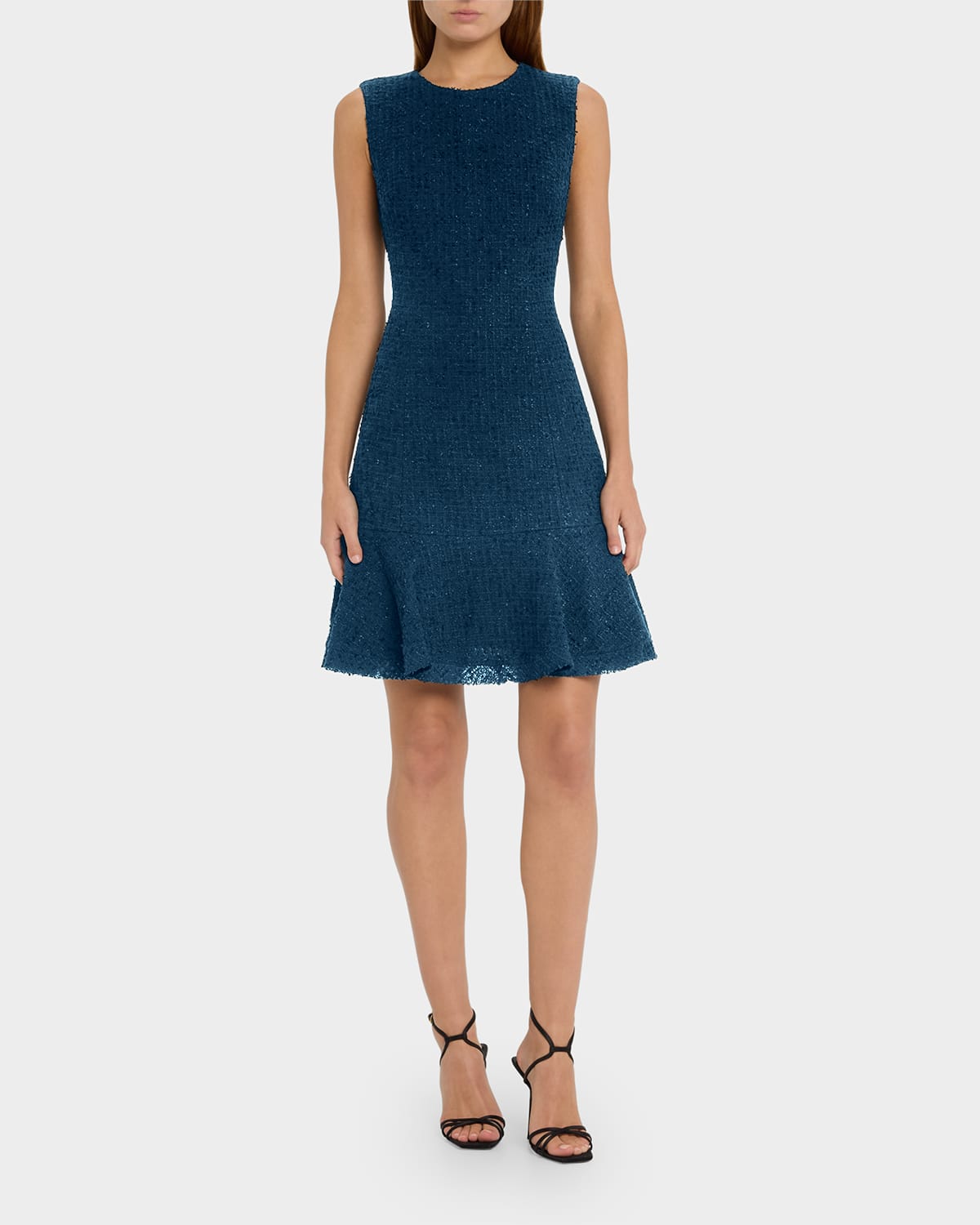 Kobi Halperin “Maui” tweed mini dress Approx. 38.5″L from shoulders to hem Jewel neckline Sleeveless Flounce ruffle hem Hem falls below the knee A-line silhouette Back zipper Polyester/cotton/cotton Lining: Polyester Dry clean Imported