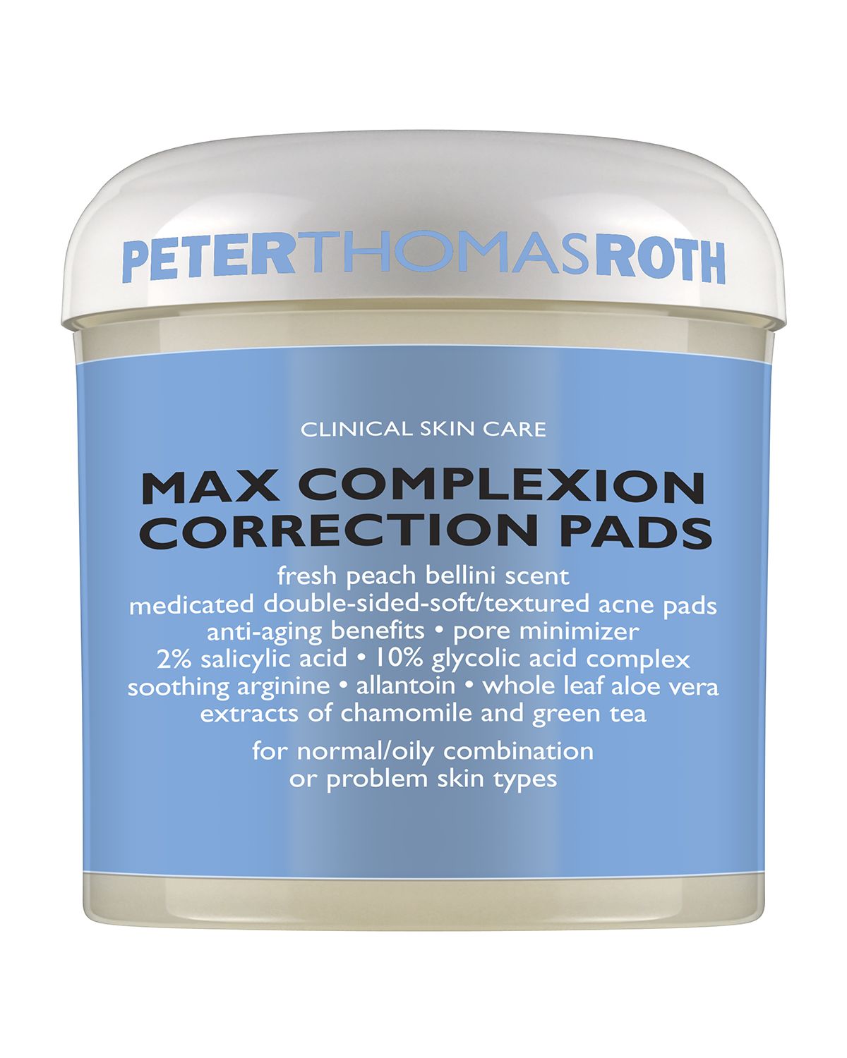 Peter Thomas Roth Max Complexion Correction Pads, 60 Count A pack of textured salicylic acid treatment pads to cleanse skin, clear up blackheads, refine the look of pores, and reduce the appearance of fine lines. All Skin Types. Key Benefits: Clear up acne and blackheads and reduce the look of pores, fine lines, and uneven skin tone with these powerful pads. The pads combine maximum strength two percent salicylic acid and potent 10 percent glycolic acid complex in an advanced botanical formul.