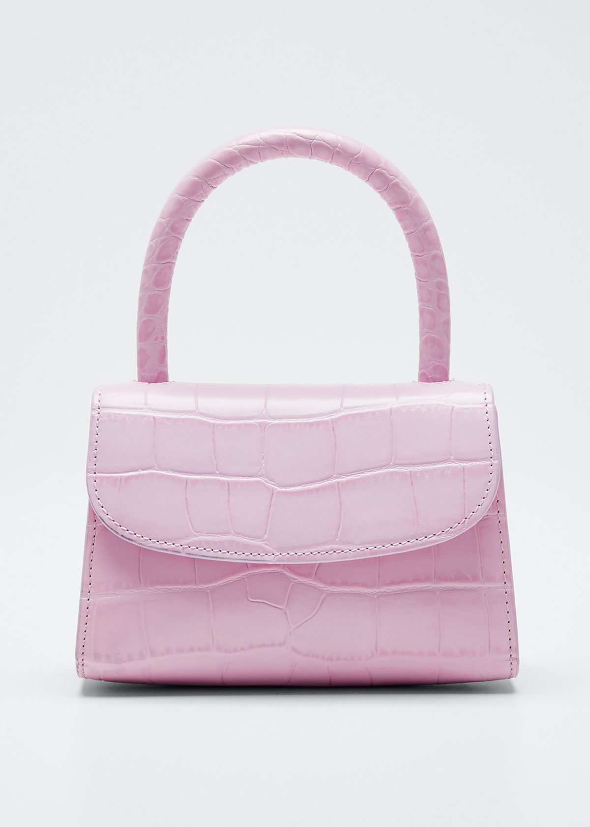 By Far crocodile-embossed calfskin top handle bag. Tubular top handle. Flap top. Interior, suede lining. 4.5″H x 6.7″W x 3″D. Made in Spain.