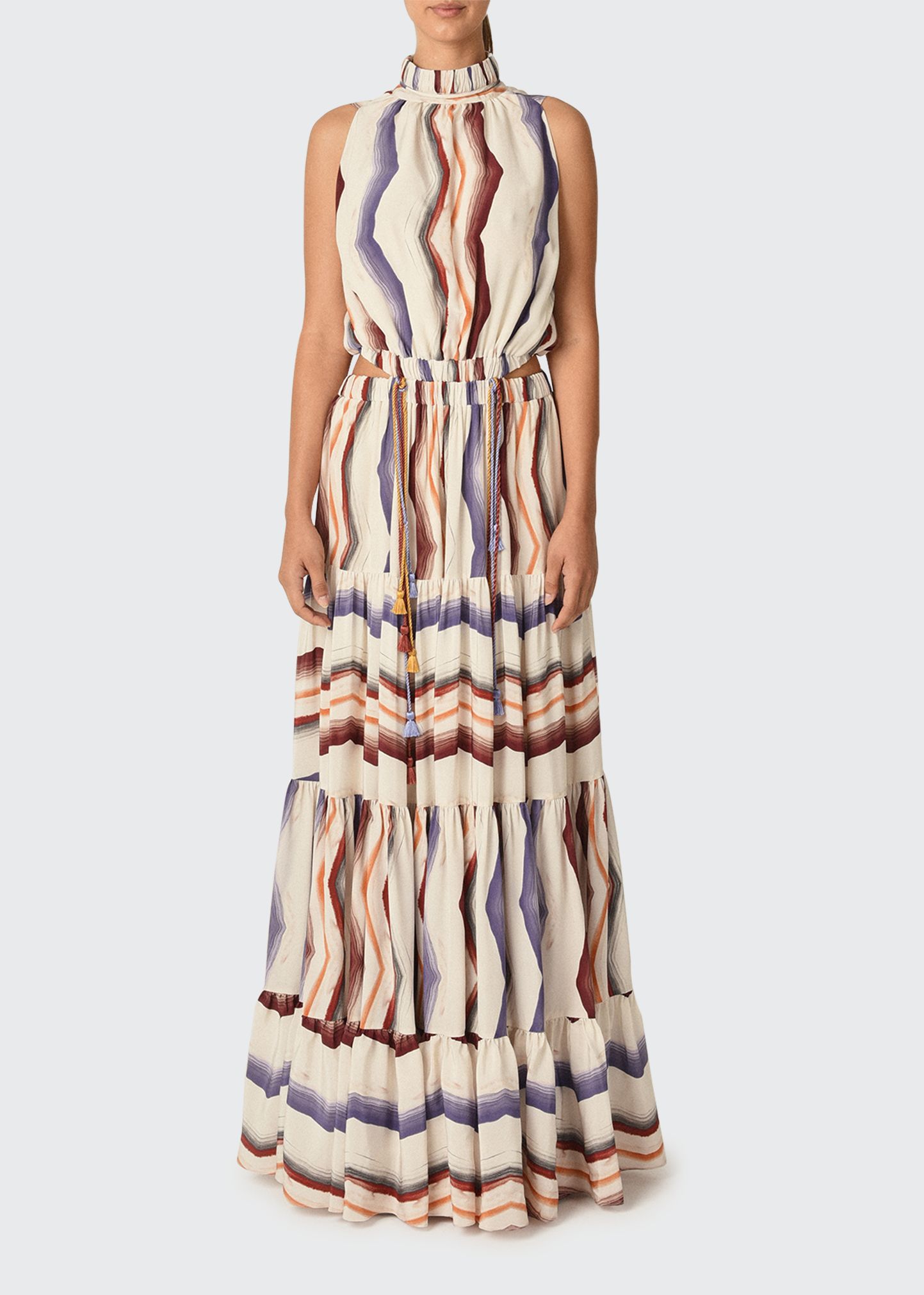 Silvia Tcherassi “Nocera” dress in painted stripe print with cutout waist Mock neckline; back button keyhole Sleeveless Elasticized drawstring waistband A-line silhouette Full length Tiered hem Silk Polyester lining Made in Colombia