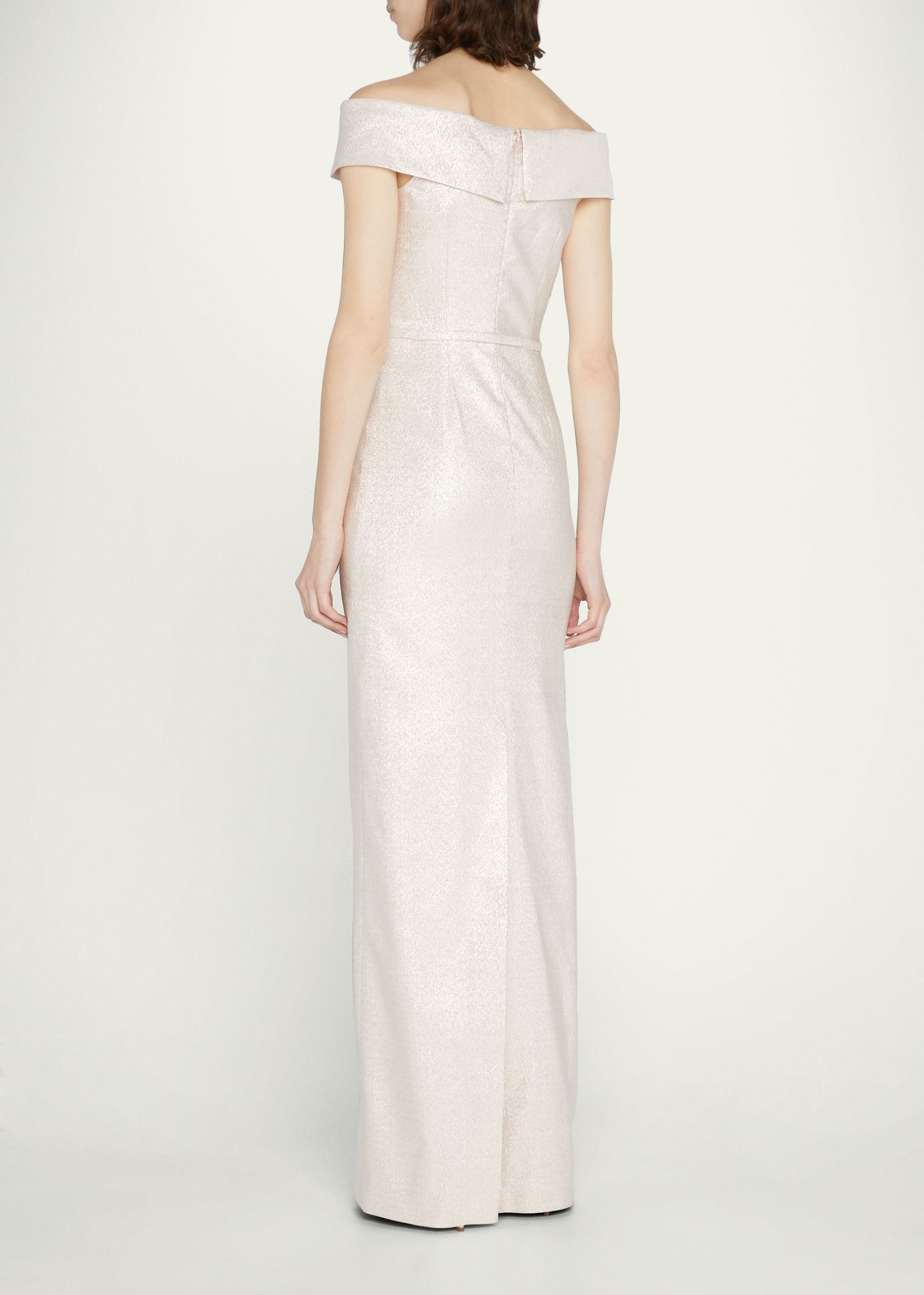 Rickie Freeman for Teri Jon stretch metallic evening gown. Approx. 62.5″L down center back. Off-the-shoulder neckline. Short sleeves. Column silhouette. Floor-length hem. Back zipper. Polyester. Imported.