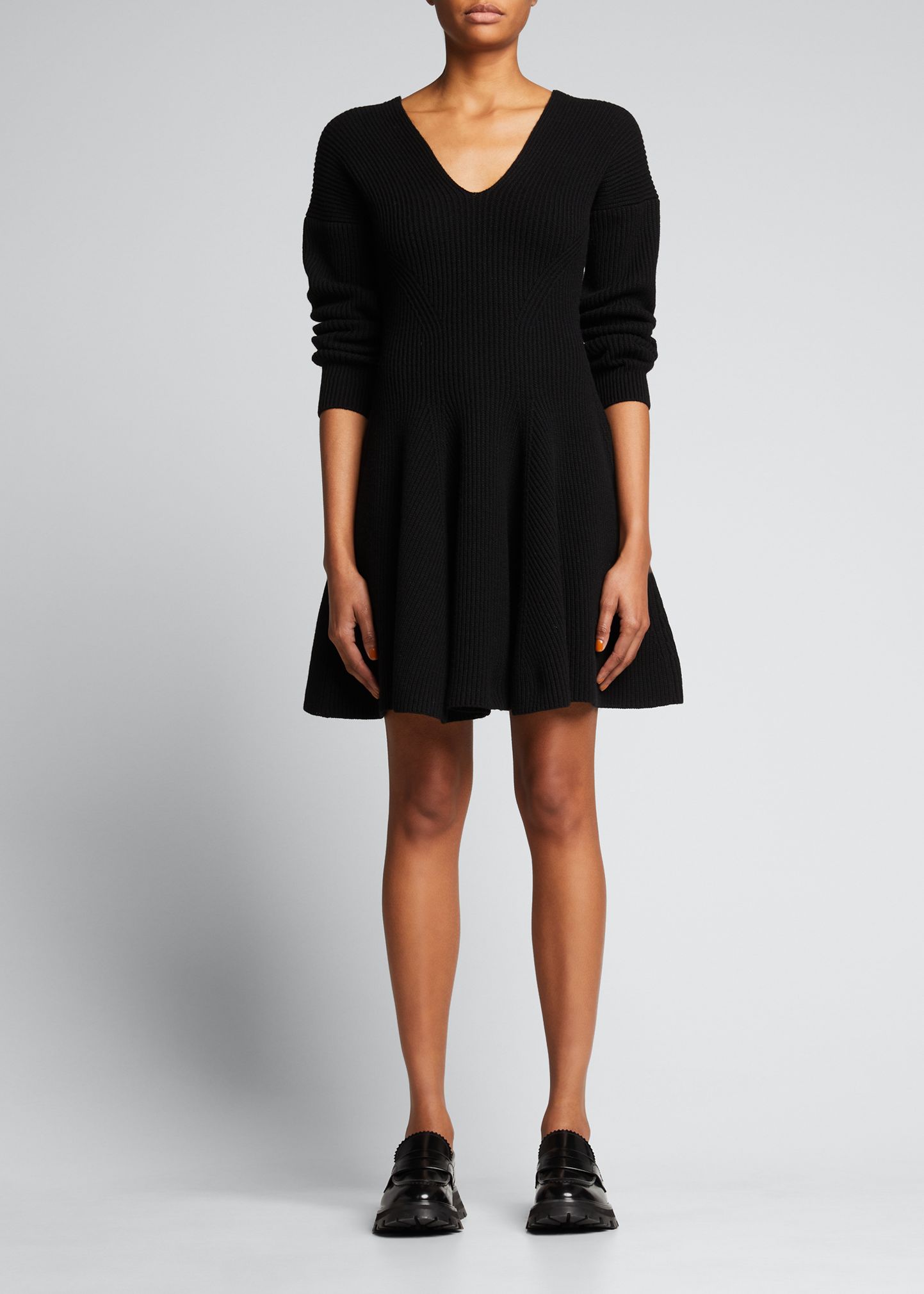 Alexander McQueen English ribbed knit dress Off-the-shoulder neckline Long sleeves Fit-and-flare silhouette Mini length Slipover style Viscose/polyamide/polyester Made in Italy