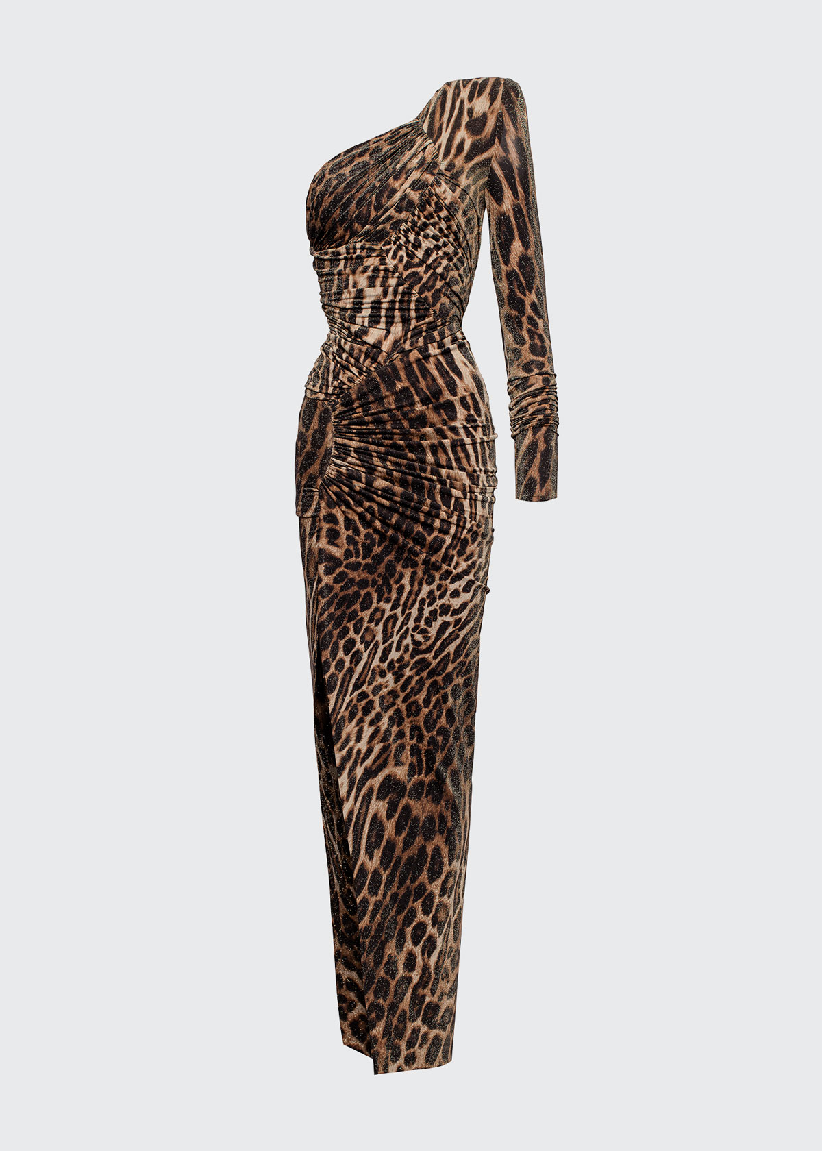 Alexandre Vauthier jersey gown in leopard print. One-shoulder neckline. Long sleeve. Ruched waist. Body-conscious silhouette. Side slit. Maxi length. Nylon/polyester/spandex. Dry clean. Made in Italy.