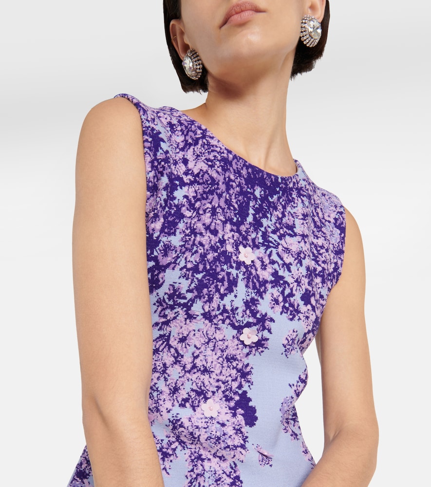 Referencing Oscar de la Renta’s signature degrade lilac motif, this jacquard knit minidress represents the label’s affinity for delicate femininity. It’s modest rounded neckline and fitted bodice flow to a softly flared skirt.