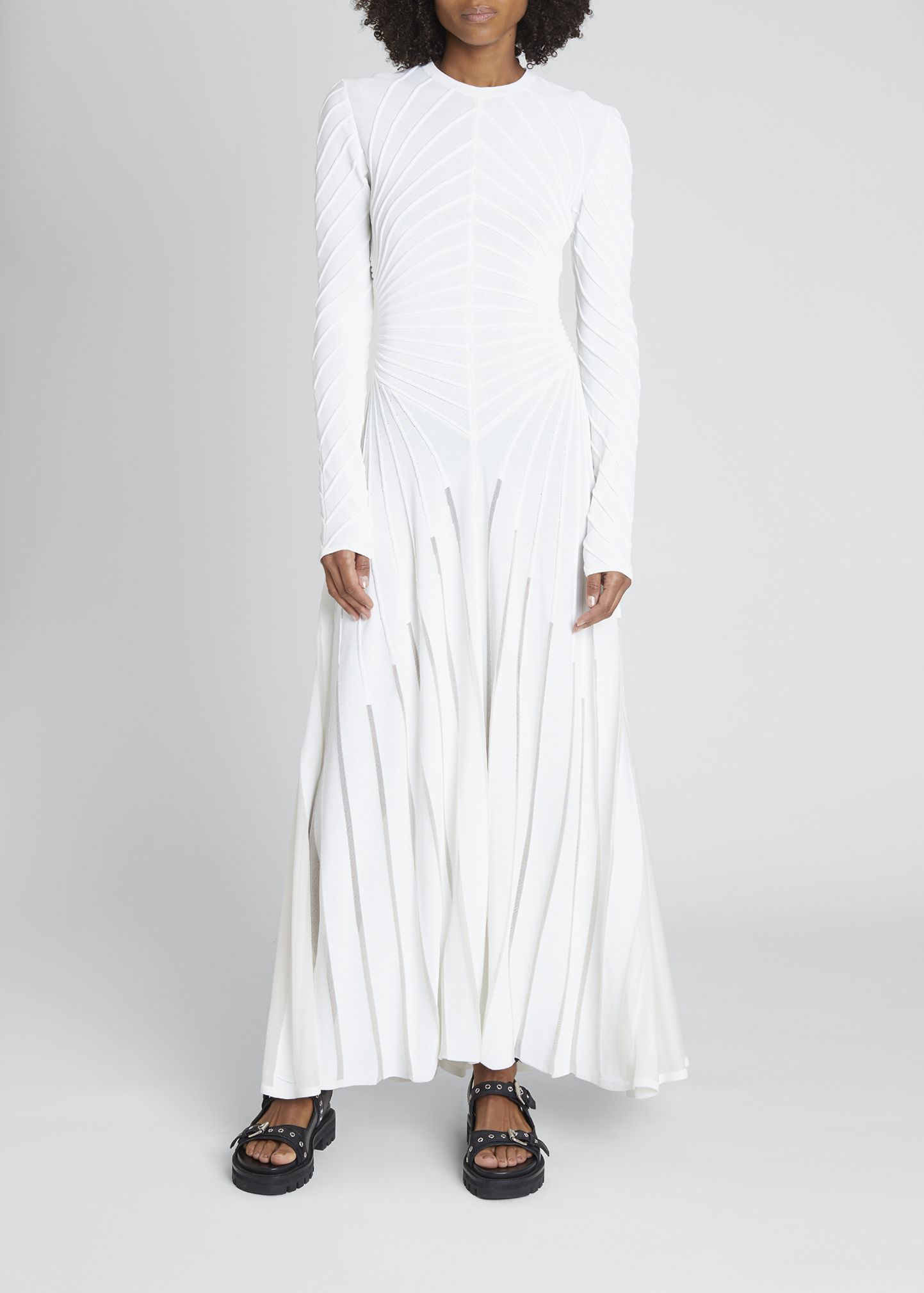 ALAIA knit dress with sculptural lines of ottoman pattern featuring sheer silk panels Jewel neckline Long sleeves Fit-and-flare silhouette Maxi length Slipover style Viscose/polyester/silk Made in Italy