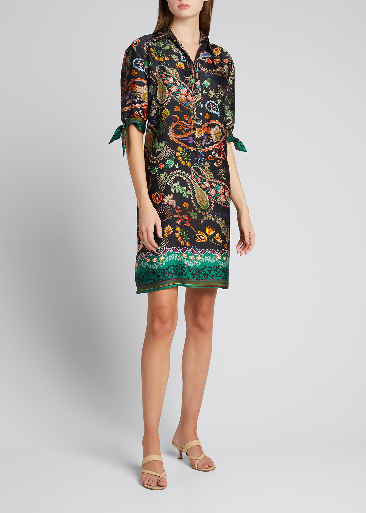 Rickie Freeman for Teri Jon cocktail dress in paisley print. Collared neckline; half button placket. Elbow sleeves; self-tie cuffs. Shift silhouette. Hem hits about at the knee. Polyester. Dry clean. Imported.