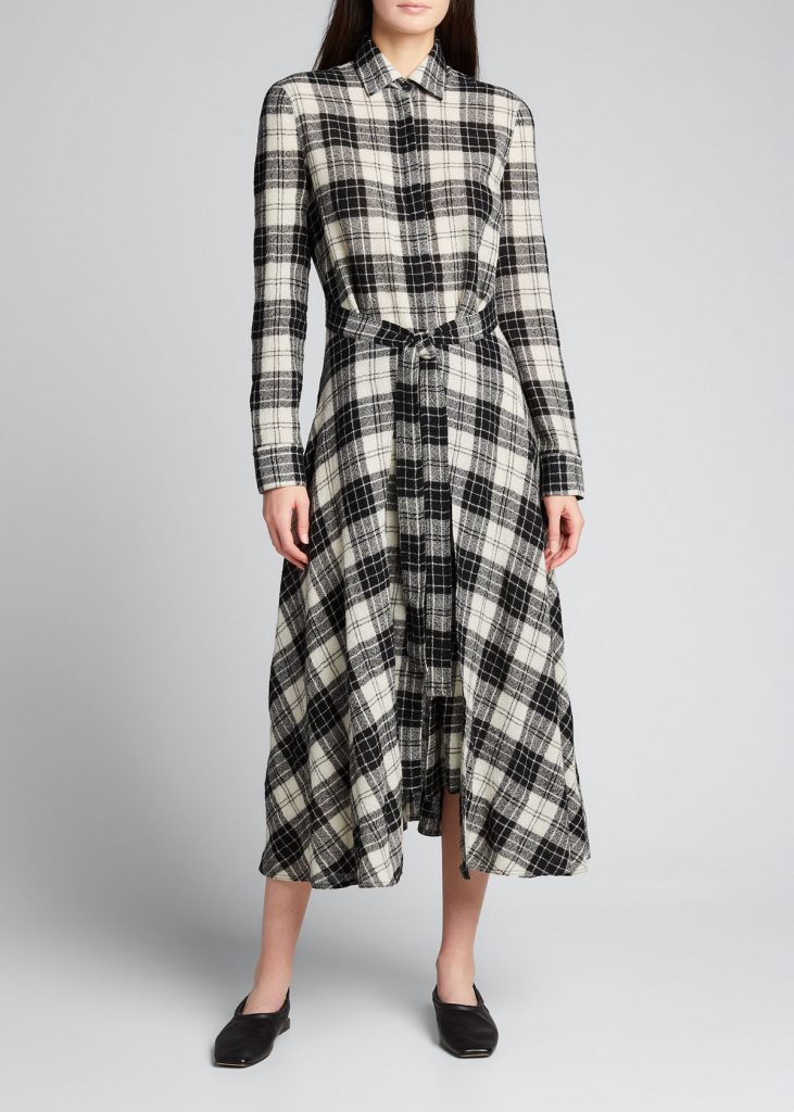 Rosetta Getty shirtdress in plaid. Spread collar; hidden closure. Long sleeves. Self-tie waist. A-line silhouette. Hem falls below the knees. Wool. Made in USA.