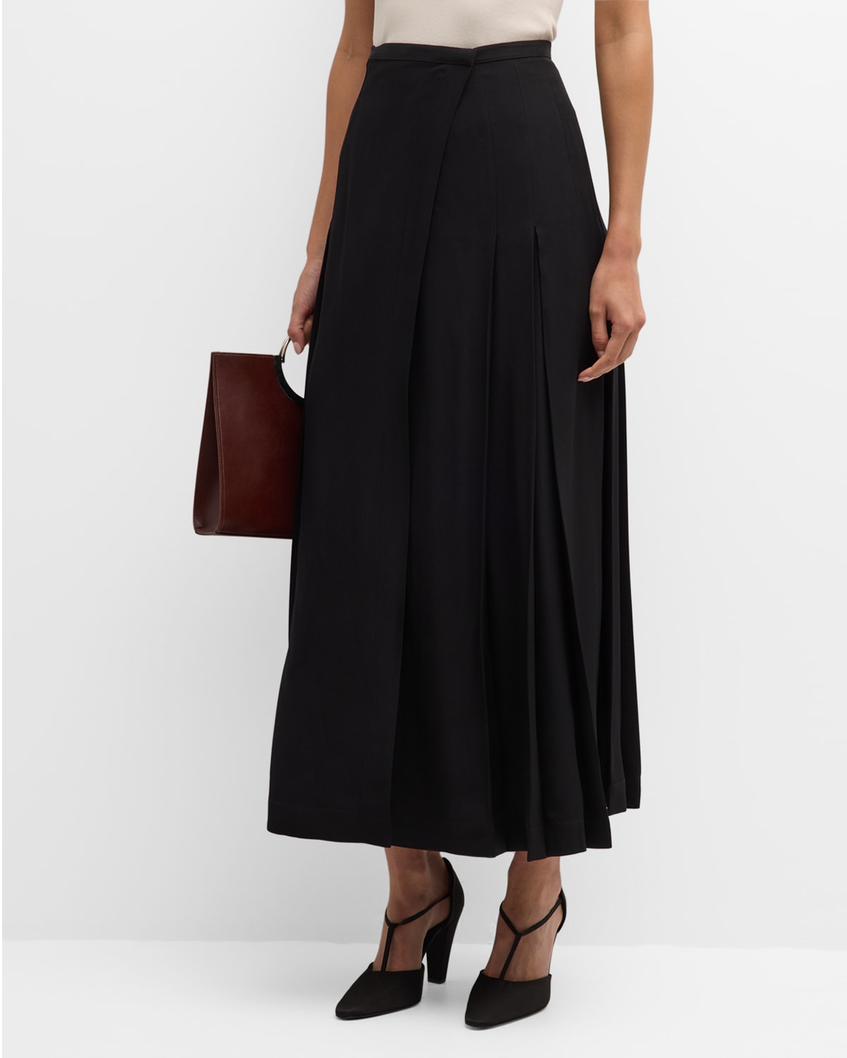 Toteme wrap skirt finished with pleating High waist Full length A-line silhouette Front waist closure Viscose Imported