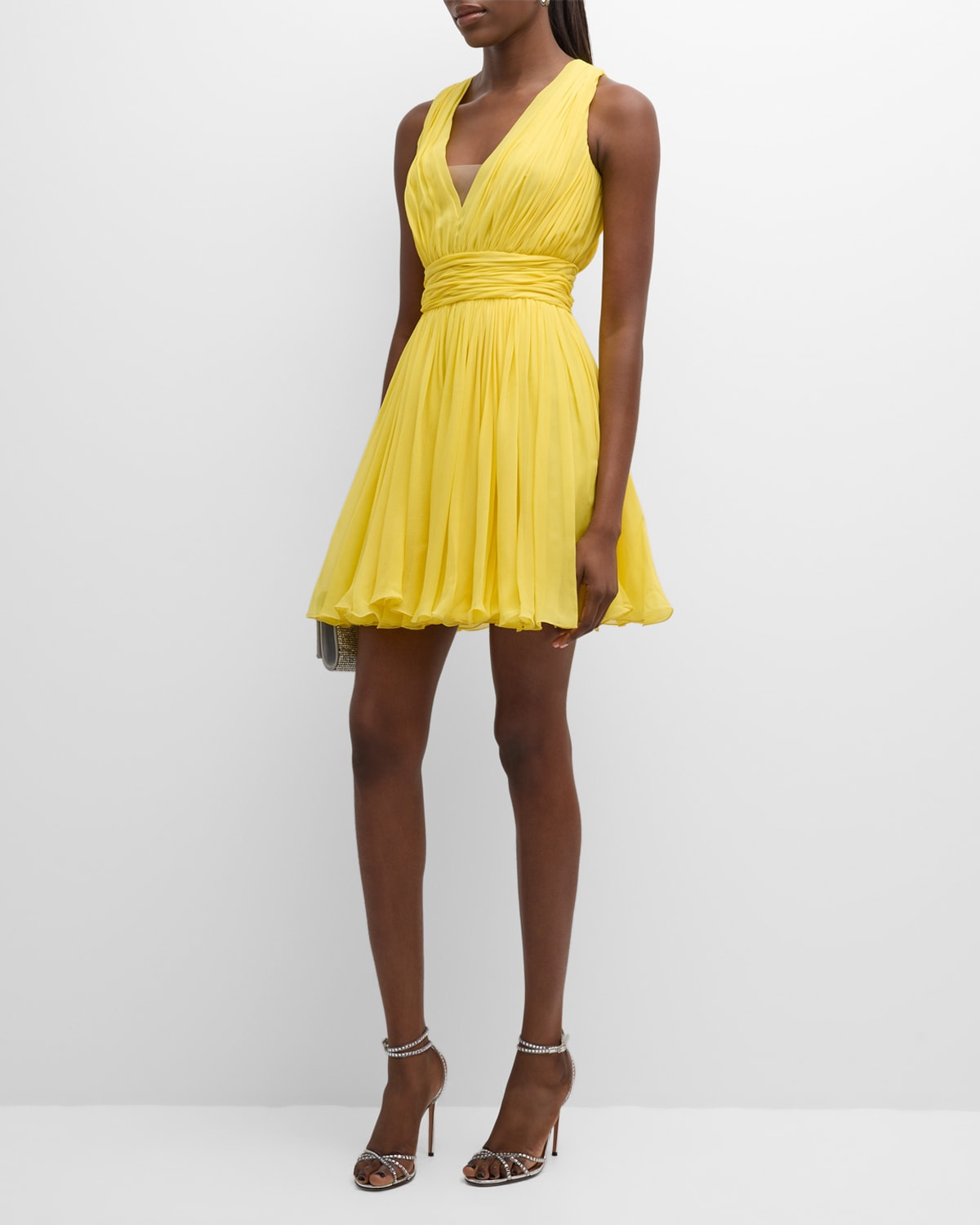 Plunging Pleated Sleeveless Silk Georgette Mini Dress
