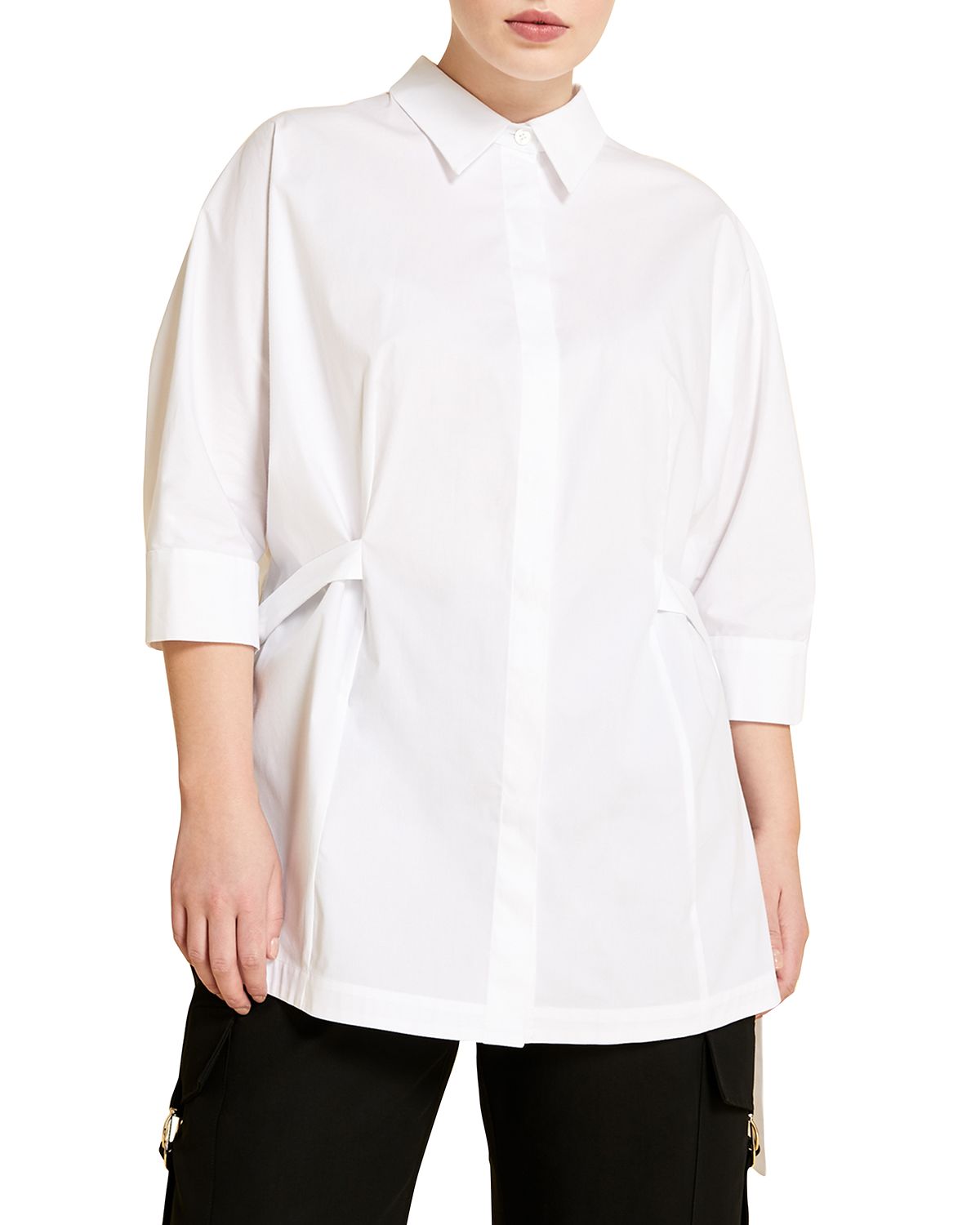 Marina Rinaldi “Battigia” shirt in stretch cotton poplin. Approx. 29.5″L from shoulder to hem. Point collar; concealed button placket. Three-quarter sleeves; button cuffs. Side ties cinch the waist. Semi-relaxed fit. Rounded side slits. Cotton/spandex. Hand wash. Made in Romania.