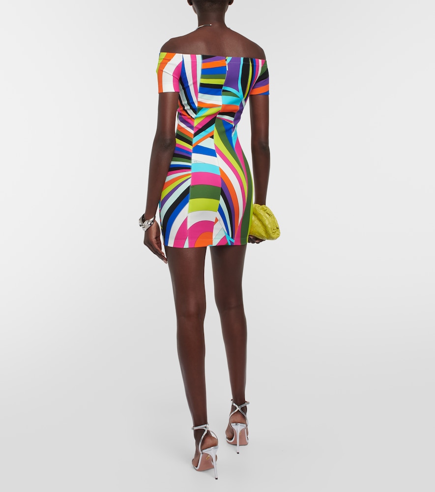 Playful and vibrant, the off-shoulder mini dress from Pucci is a party staple in the summer. This Iride-print design has a straight neckline and fitted silhouette.