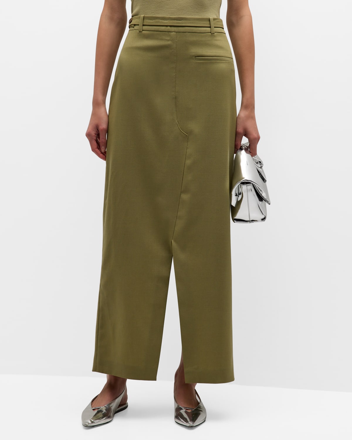 Rohe Women heavy wool maxi skirt featuring an attached belt Mid-rise; sits at the hip Single front and back welt pocket Tailored silhouette Front and back center slit Button closure Virgin wool Hand wash or dry clean Made in Italy