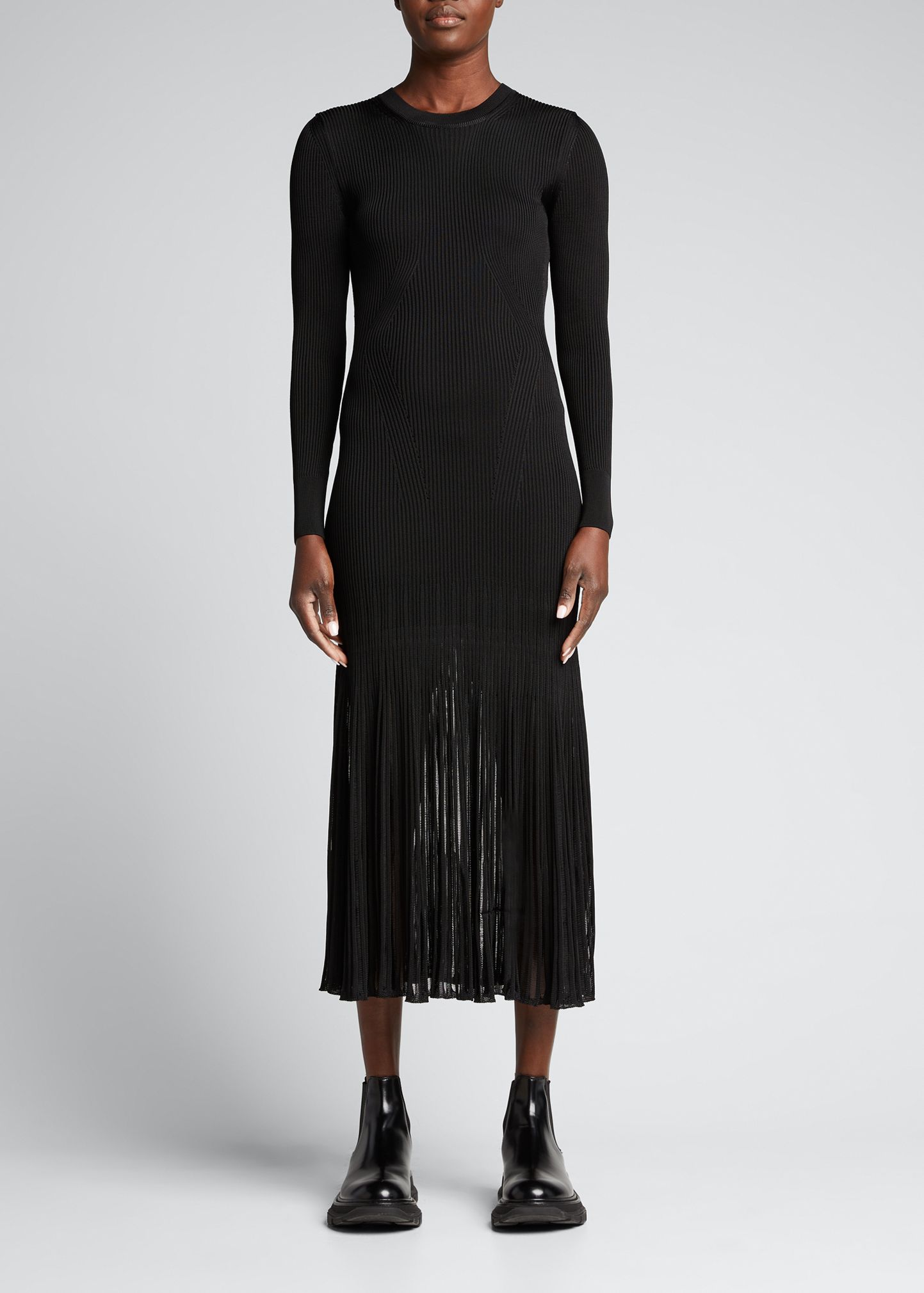 Alexander McQueen engineered ribbed-knit dress featuring laddered hem detailing Round neckline Long sleeves Column silhouette Maxi length Viscose/polyamide/polyester Made in Italy