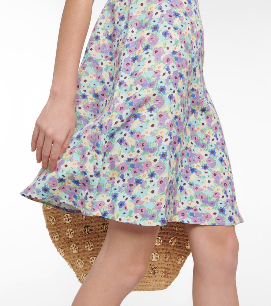 Rixo’s Pearl minidress fuses a chunky crochet-knit bust with a delicate floral skirt. The unique design has a hand-stitched bust, puffed sleeves, and a flowing linen-blend skirt.
