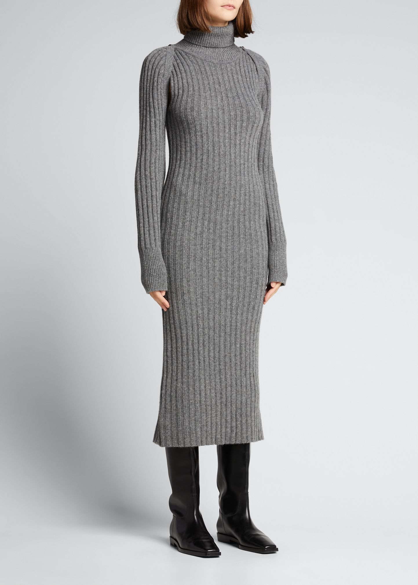RECTO ribbed sweater dress with detachable sleeves Turtleneck Long sleeves Center back vent Hem falls below the knee Sheath silhouette Wool/nylon/cashmere Unlined Dry clean Imported
