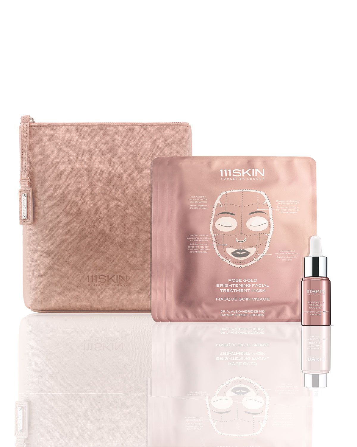 Shake well before use. Mix 1-2 drops with your moisturizer or apply directly to skin after cleansing. Rose Gold Brightening Facial Treatment Mask: Cleanse skin thoroughly. Remove protective film on both sides. Apply the middle sheet evenly onto your face keeping the eye and mouth area clear. Leave on for 20 minutes. Remove the mask and let the skin absorb the remaining essence by gently patting the skin. Follow with your regular 111SKIN regime.