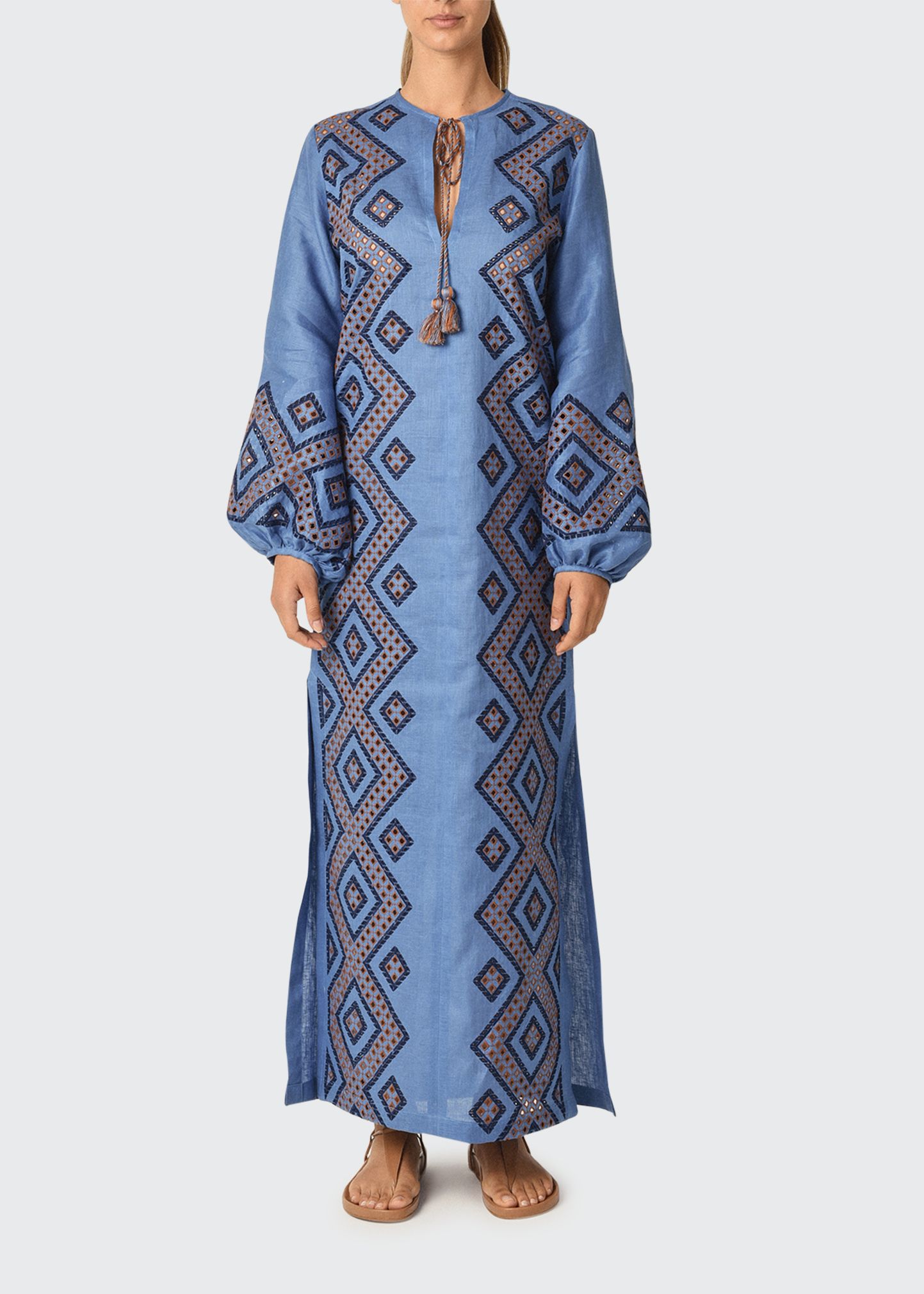 Silvia Tcherassi “Sarzana” tunic dress in diamond pattern with cutout detail Split neckline with tassel self-tie Long balloon sleeves A-line silhouette Maxi length Side slits Slipover style Linen/cotton/polyester Polyester lining Made in Colombia