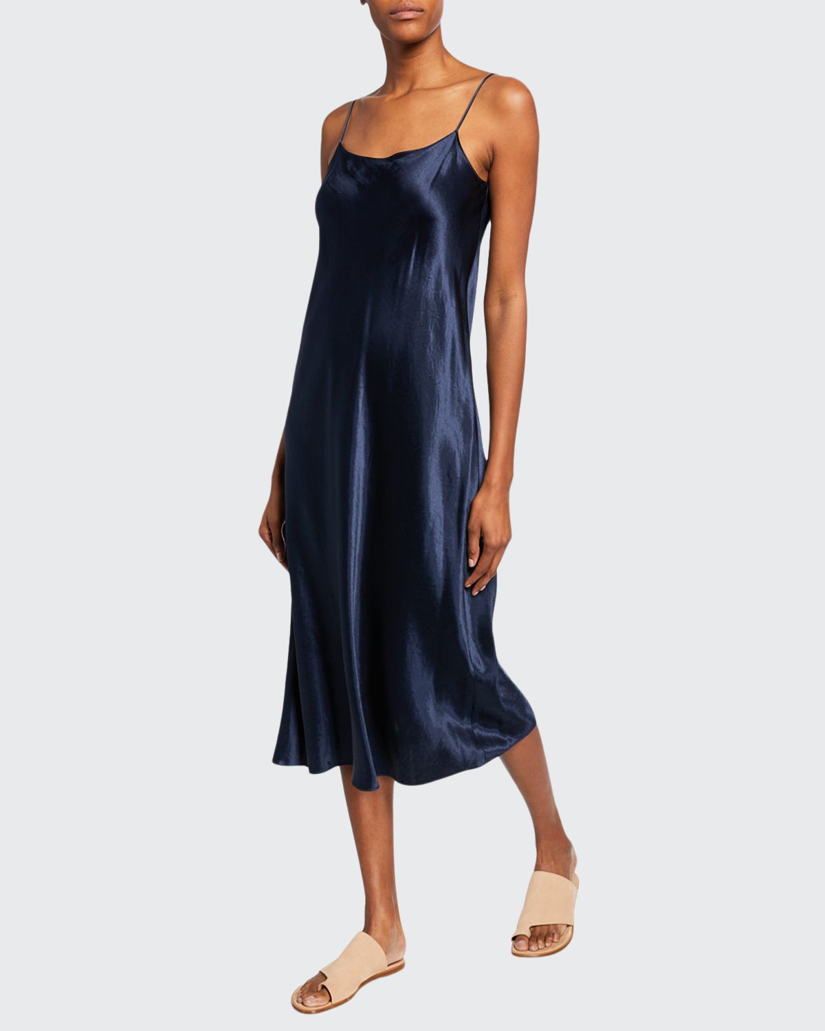 Exclusively ours. Vince satin dress. Scoop neckline. Delicate, adjustable straps. Column silhouette. Midi length. Slipover style. Acetate. Imported.