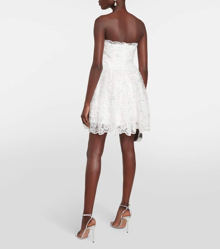Brimming with shimmering silver sequins and beads, Self-Portrait’s minidress is sure to turn heads. This piece has a strapless silhouette with scallop trims, a fitted bodice, and a flared skirt.
