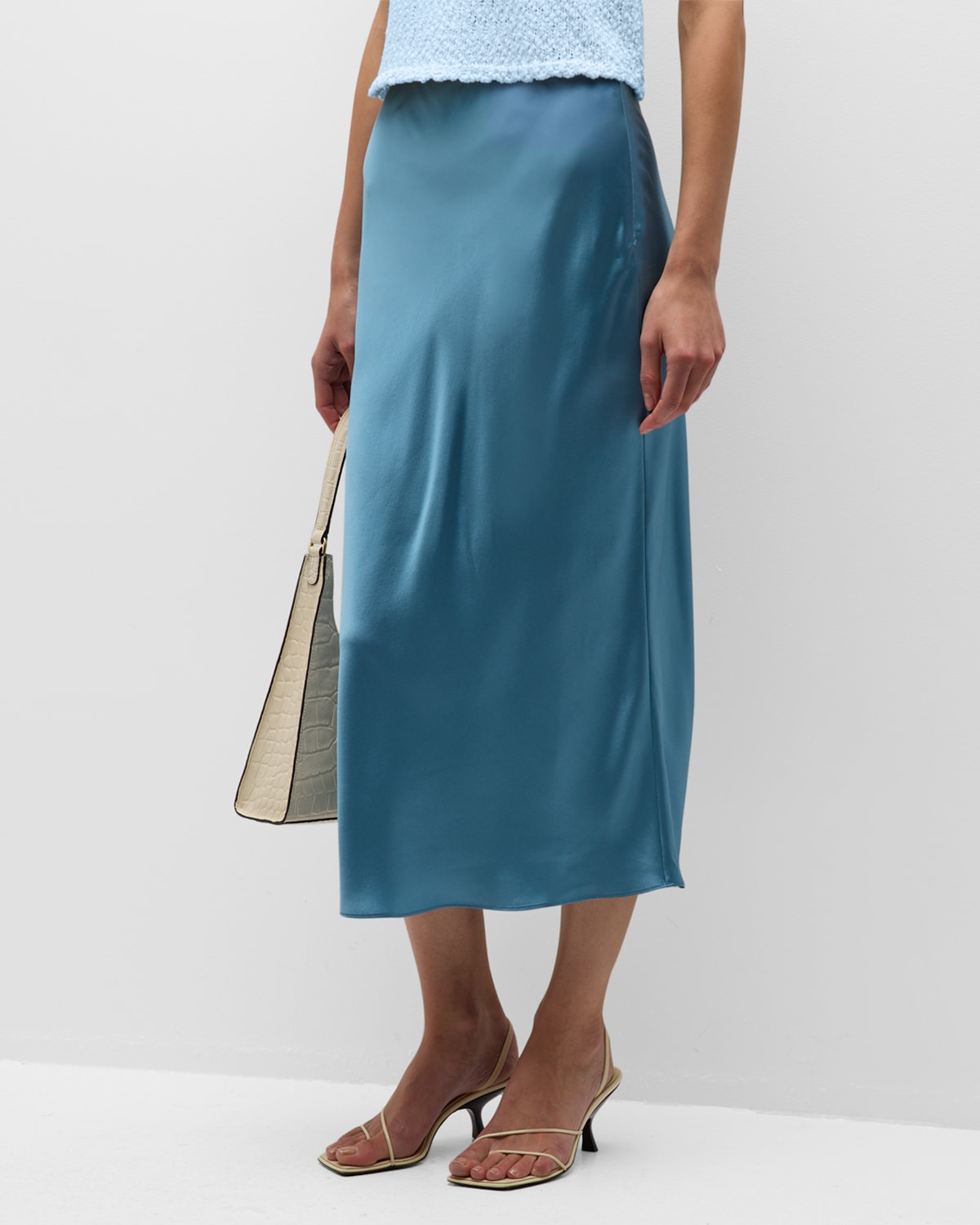 Sablyn skirt in a lustrous finish High-rise waistband Hem falls below the knee A-line silhouette Slip-on style Silk Dry clean Made in USA