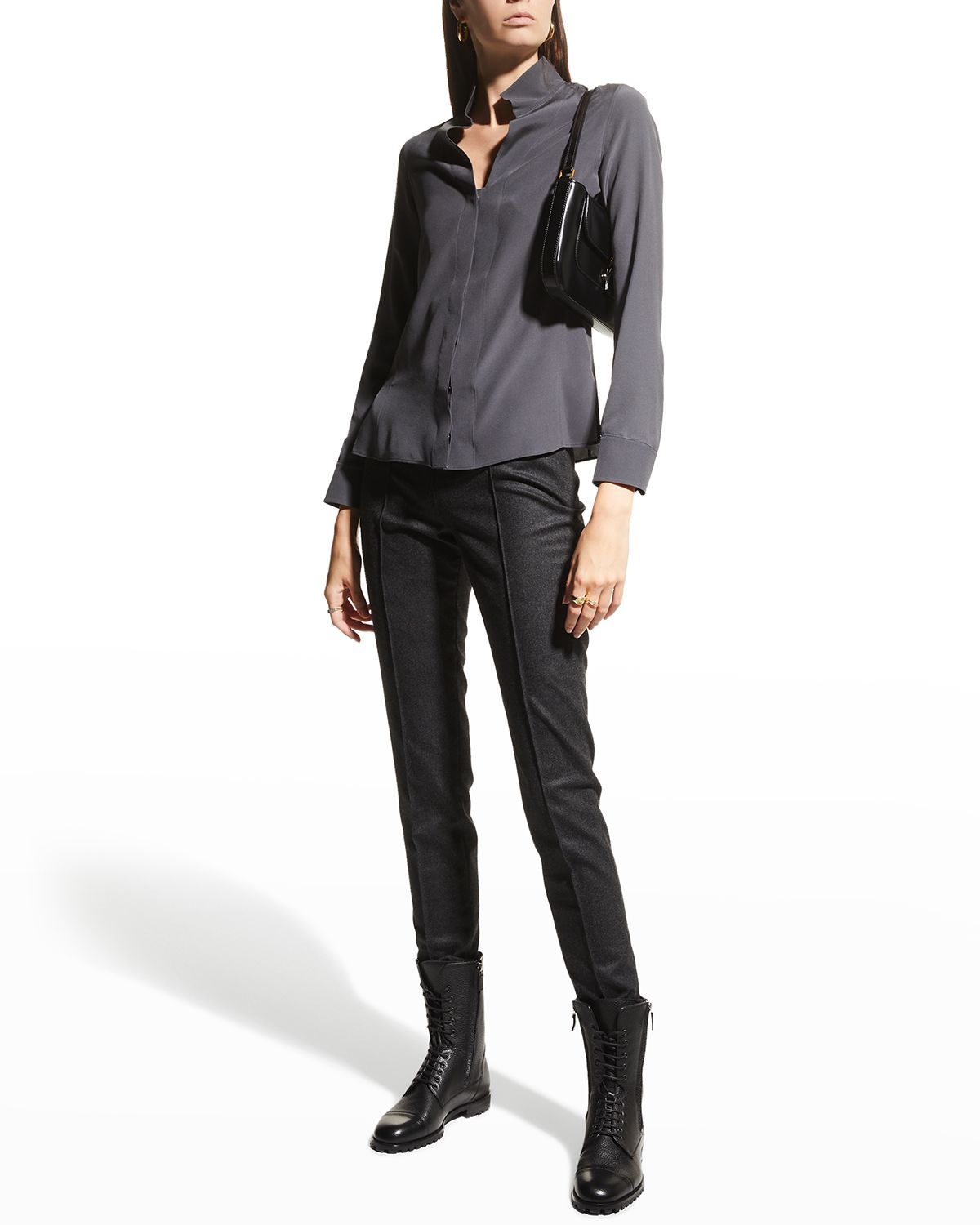Akris silk crepe blouse Stand collar; concealed front placket Long sleeves; button cuffs Relaxed fit Side slit hem Silk Imported
