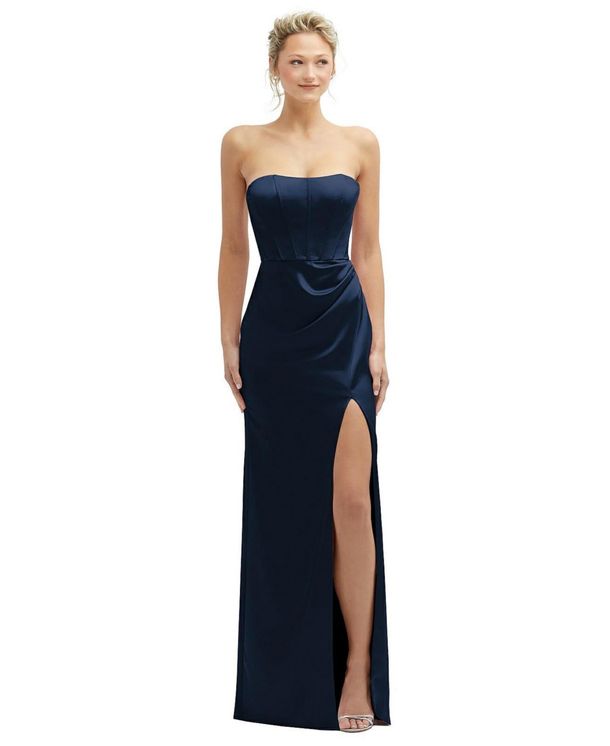 Strapless Topstitched Corset Satin Maxi Dress with Draped Column Skirt – Midnight navy