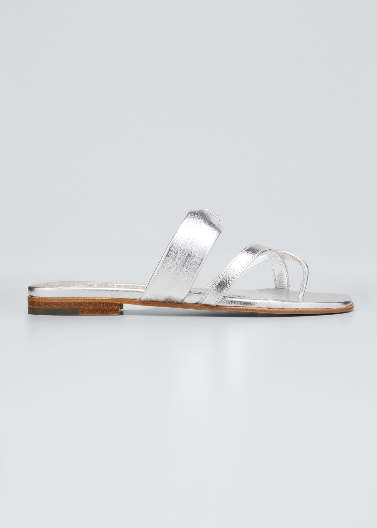 Manolo Blahnik “Subo” metallic leather sandals. Flat heel. Crisscross toe strap. Mid-vamp strap. Slide style. Leather lining and sole. Made in Italy.