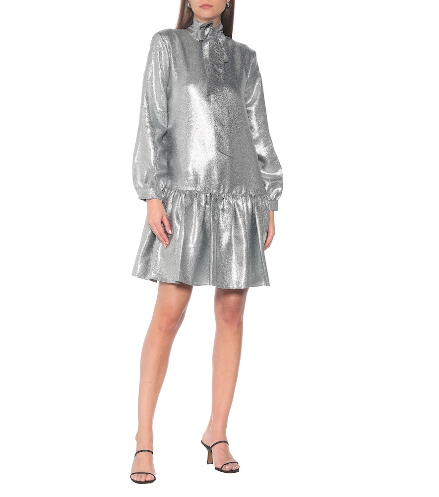 Woven with silver lame fibers for a lustrous finish, Tibi girls will dazzle on the dancefloor when wearing this minidress. Its relaxed fit is tempered by balloon sleeves and a drop-waist, while the self-tie neckline encourages you to experiment with and up-do. Make it work for cold winter nights with sheer tights and velvet pumps.