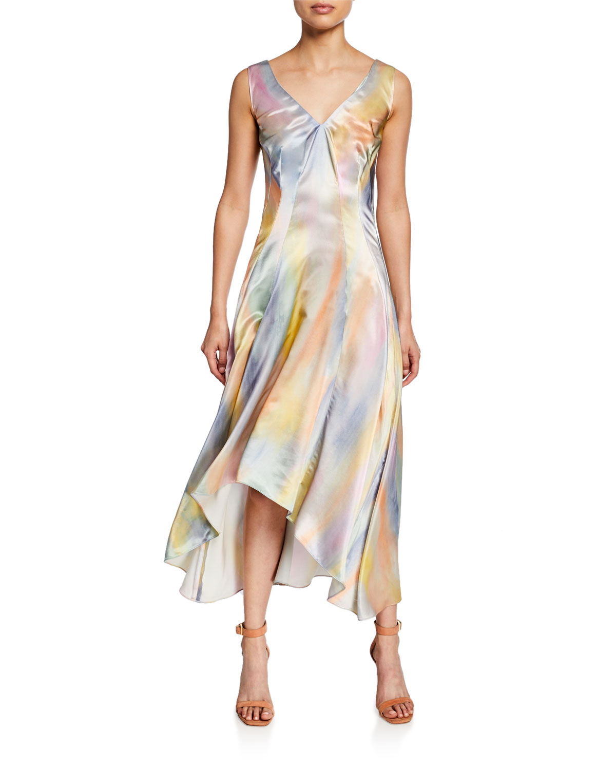 Sies Marjan cocktail dress in tie-dyed satin. V neckline. Sleeveless. A-line silhouette. High-low hem. Back zip. Viscose. Made in USA of imported material.
