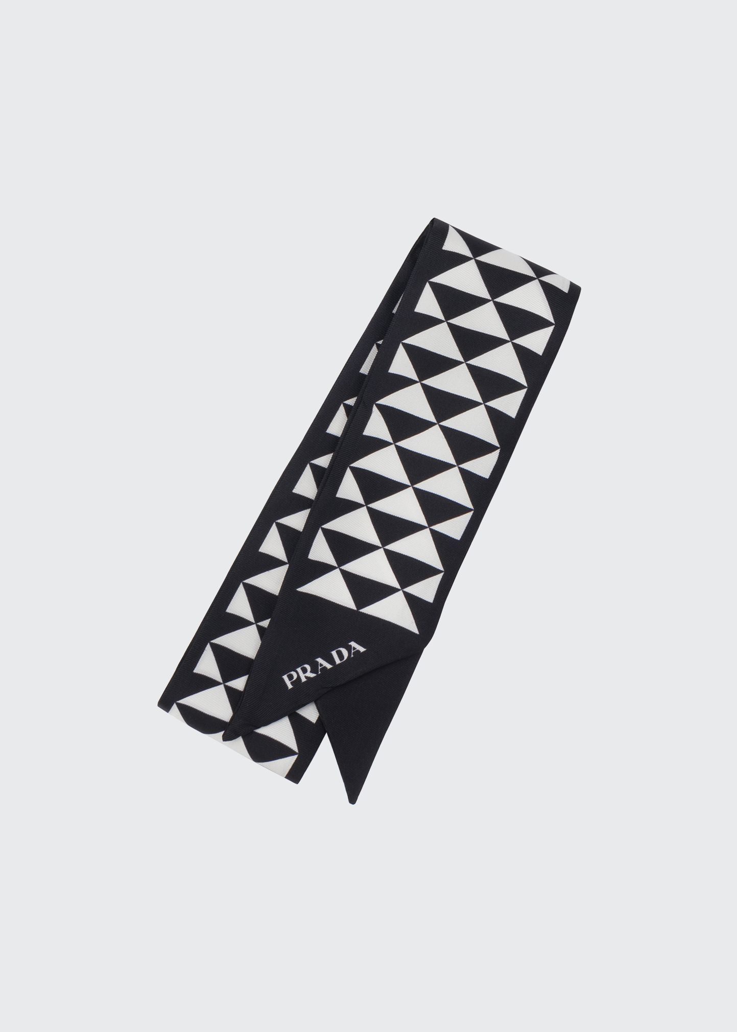 Prada iconic triangle printed scarf in lightweight silk twill. May be styled multiple ways. Approx. 33.5″H x 1.2″W. Silk. Made in Italy.