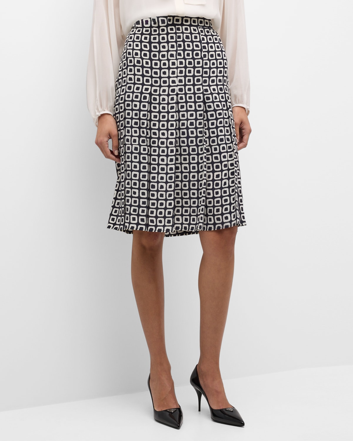 Max Mara Studio “Utopico” pleated midi skirt in a geometric print Sits high on the hips Hem hits around the knee A-line silhouette Silk Dry clean Made in Poland