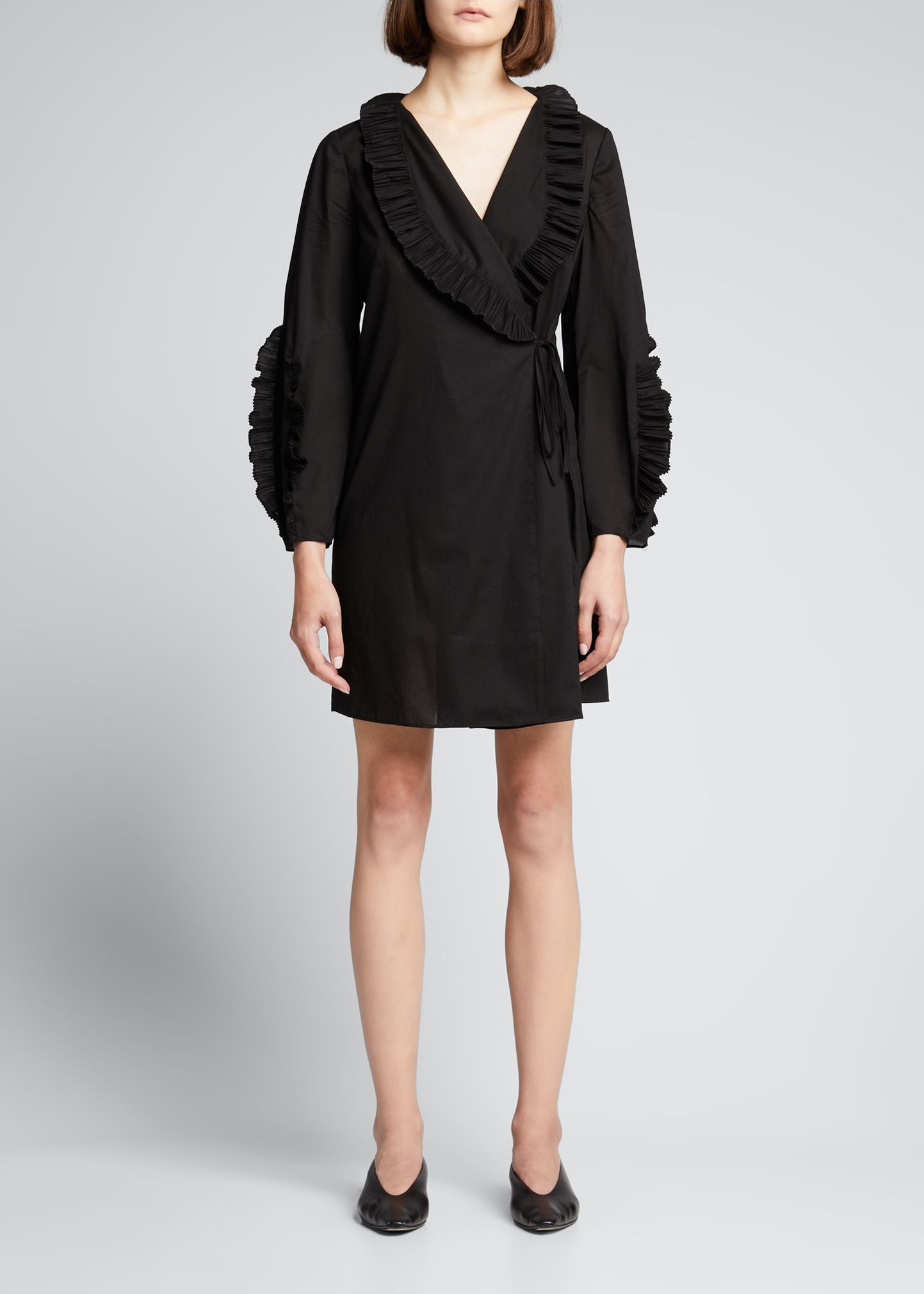 Rebecca Taylor wrap dress in cotton voile with ruffle trim Surplice neckline Long sleeves A-line silhouette Self-tie wrap closure Hem falls above the knee Cotton Dry clean Imported