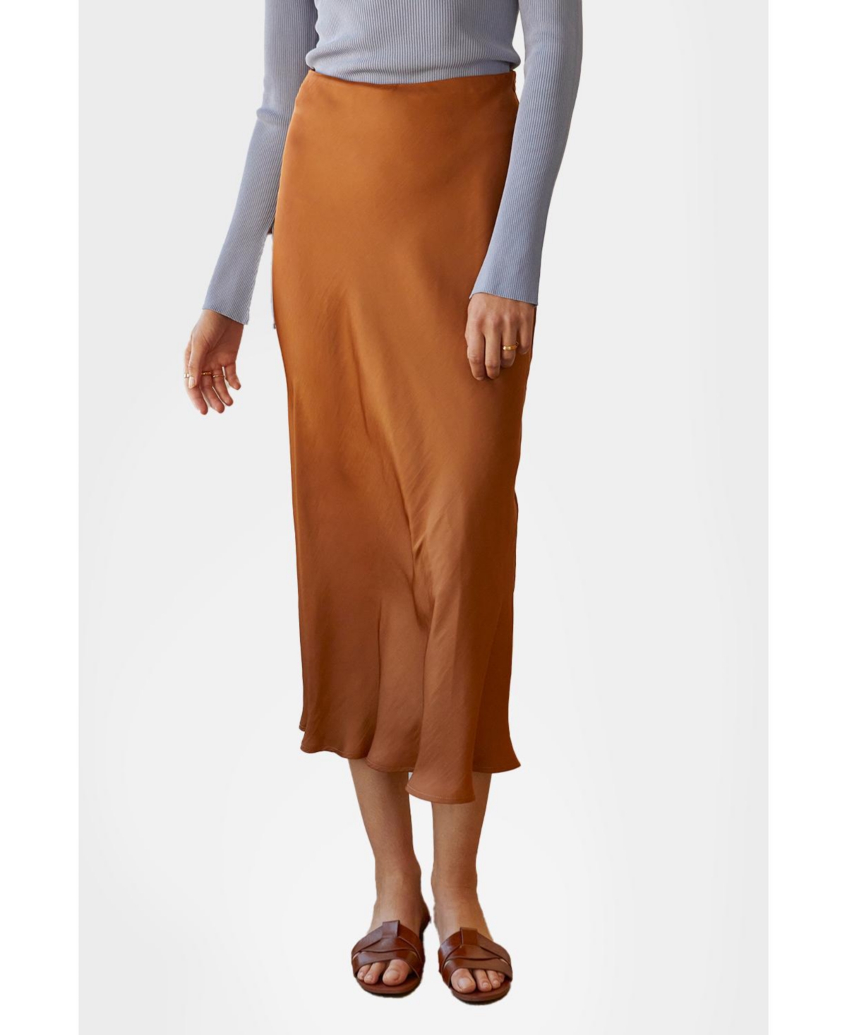 Walk into summer with Crescent’s satin midi skirt. This skirt is crafted with a luxe satin and is cut on the bias for figure hugging drape. Displaying an A-cut hem and clean finish waist self facing.