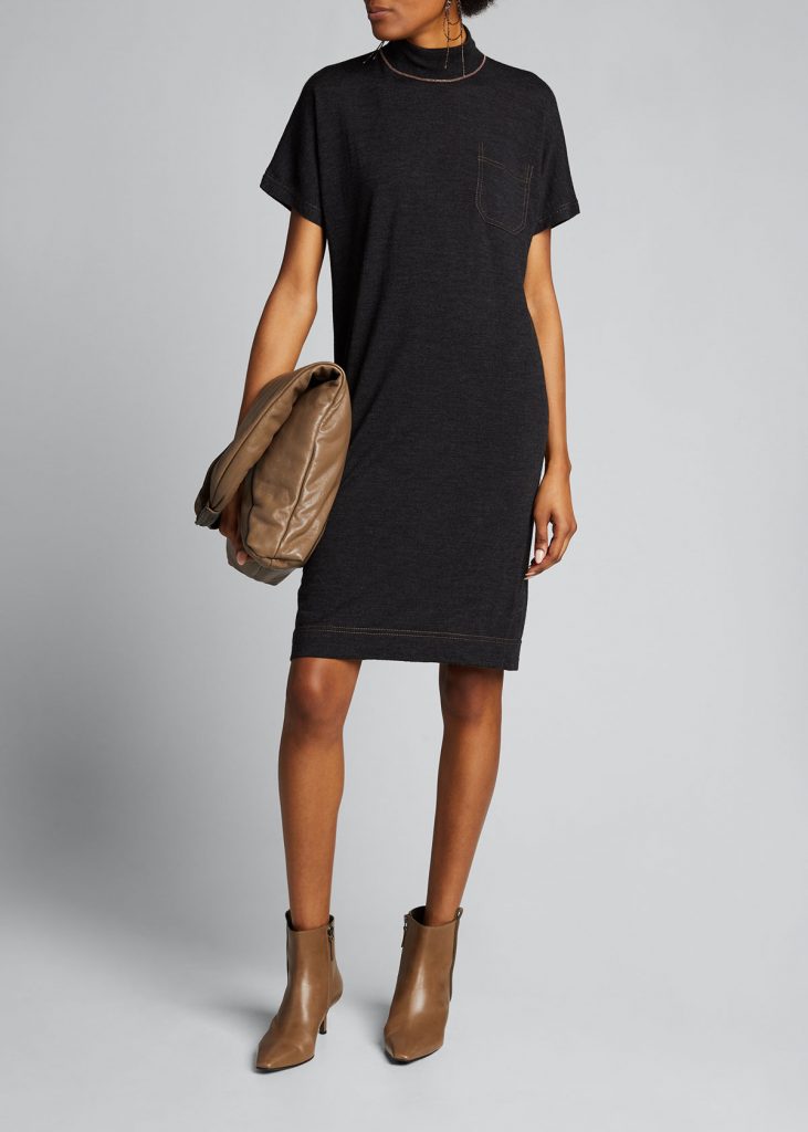 Brunello Cucinelli dress in wool-cashmere with contrast stitching. Turtleneck with monili beading. Short dolman sleeves. Shift silhouette. Hem hits about at the knee. Slipover style. Virgin wool/cashmere. Made in Italy.
