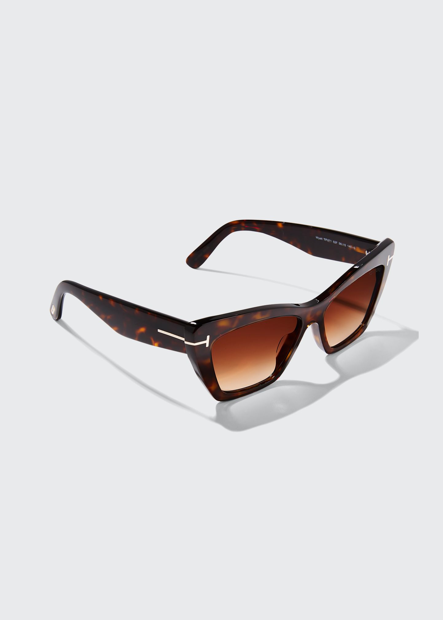 TOM FORD “Wyatt” cat-eye sunglasses in plastic Lens/bridge/temple (in mm): 56-15-140 Gradient lenses; logo script on left Signature “T” through temples Wide, tapered arms Logo metal medallion on earpieces 100% UVA/UVB protection Made in Italy