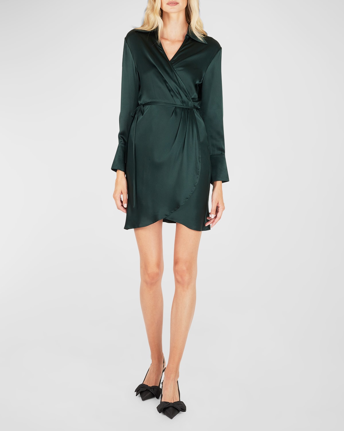 Secret Mission “Zelda” lustrous silk wrap dress Approx. 35″L from shoulder to hem Collared surplice neckline Long sleeves Button cuffs Self-tie waist Yoked back Hem falls above the knee Silk Hand wash or dry clean Imported